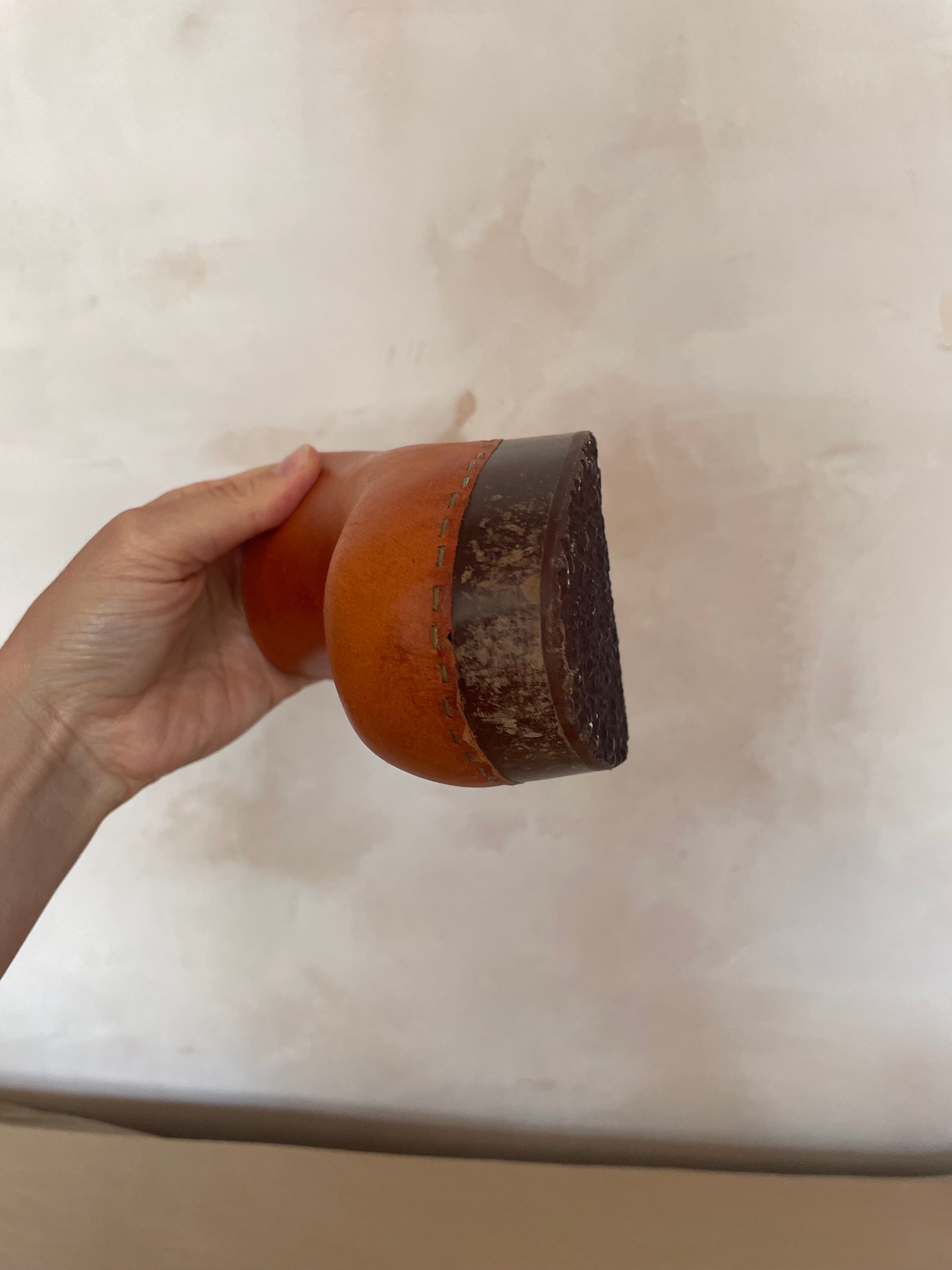 Our Cumin Fieno leather is a deliciously warm and rich tan colour. Pull Up leather is dyed with a soluble dye that enhances rather than conceals the leather’s natural surface. The colour is sealed with a natural oil rather than covered or coated, so it migrates during the wet moulding process, giving the final appearance a mottled, almost antique look. The leather stays buttery soft. Scuffs and scratches blend and become a part of the story of the leather, so with time and wear, the surface will evolve and change to be totally unique to you. Please note: all our clogs are made using natural materials whose appearance will vary from pair to pair.