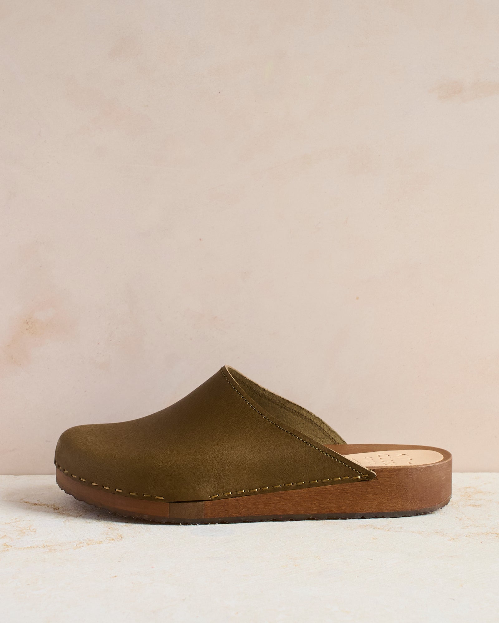 Our flex base clogs celebrate their origins in traditional workwear but are elevated by contemporary details and unparalleled comfort. Our Flex Base Klassisk has stapled leather uppers with a rounded toe and open back. The slim, flexible clog base has a strip of rubber at the ball of the foot allowing your foot to bend with each step. Moss is a lovely, earthy khaki green colour.