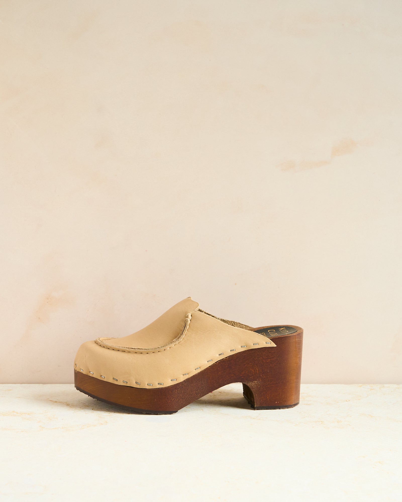 The chunky heel is a comfortable 80mm, giving you extra height without the feeling of wearing heels. The water-resistant Lime wood base has a 100% recycled rubber grip sole and is ergonomically shaped inside and out for comfort. The lime wood used is grown only 2 hours away from the factory where the bases are made. Another family-run business, production supports a small team of approximately 10 craftspeople in Valencia. The rubber sole is made from 80% recycled TPU and 20% recycled PET.